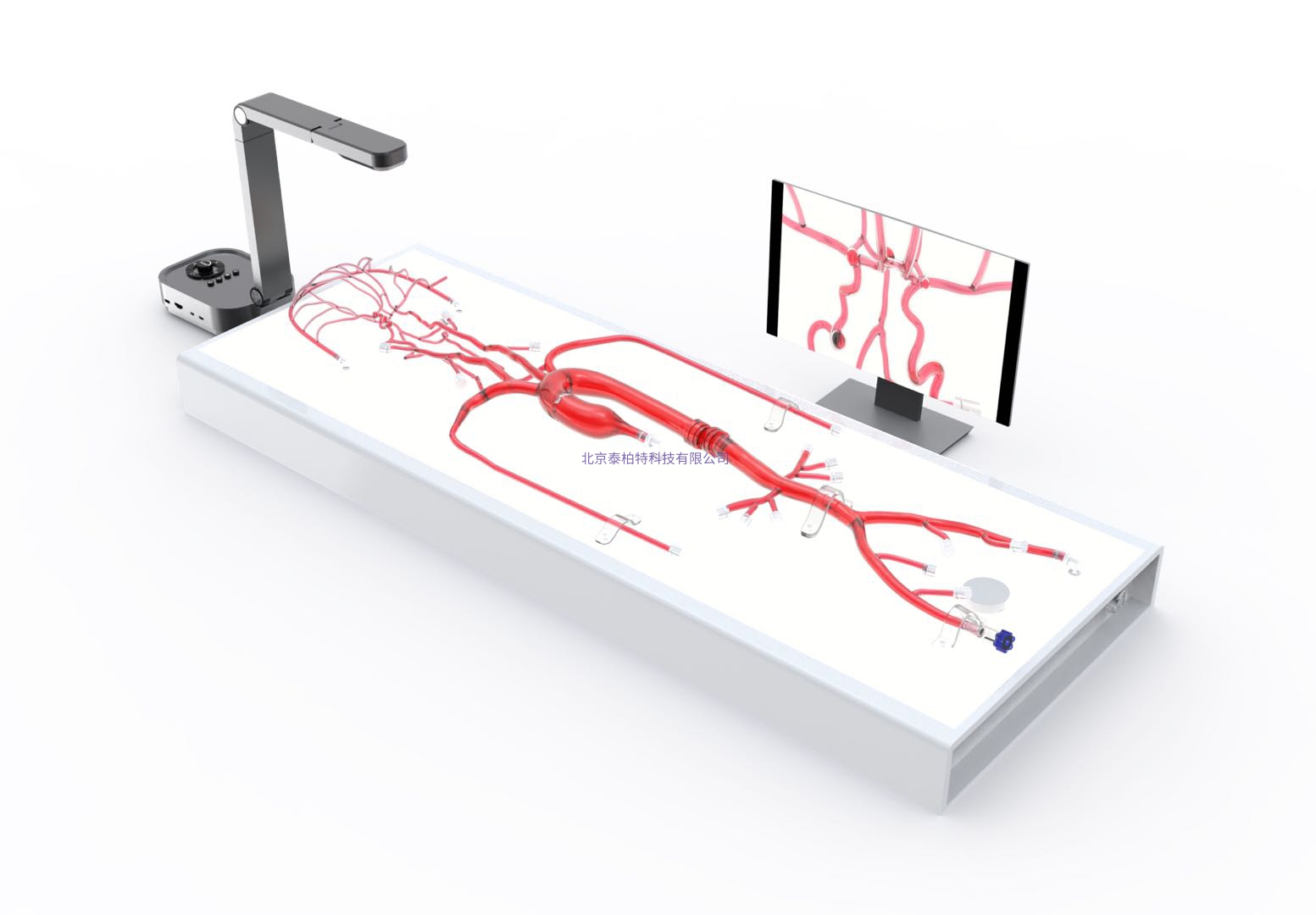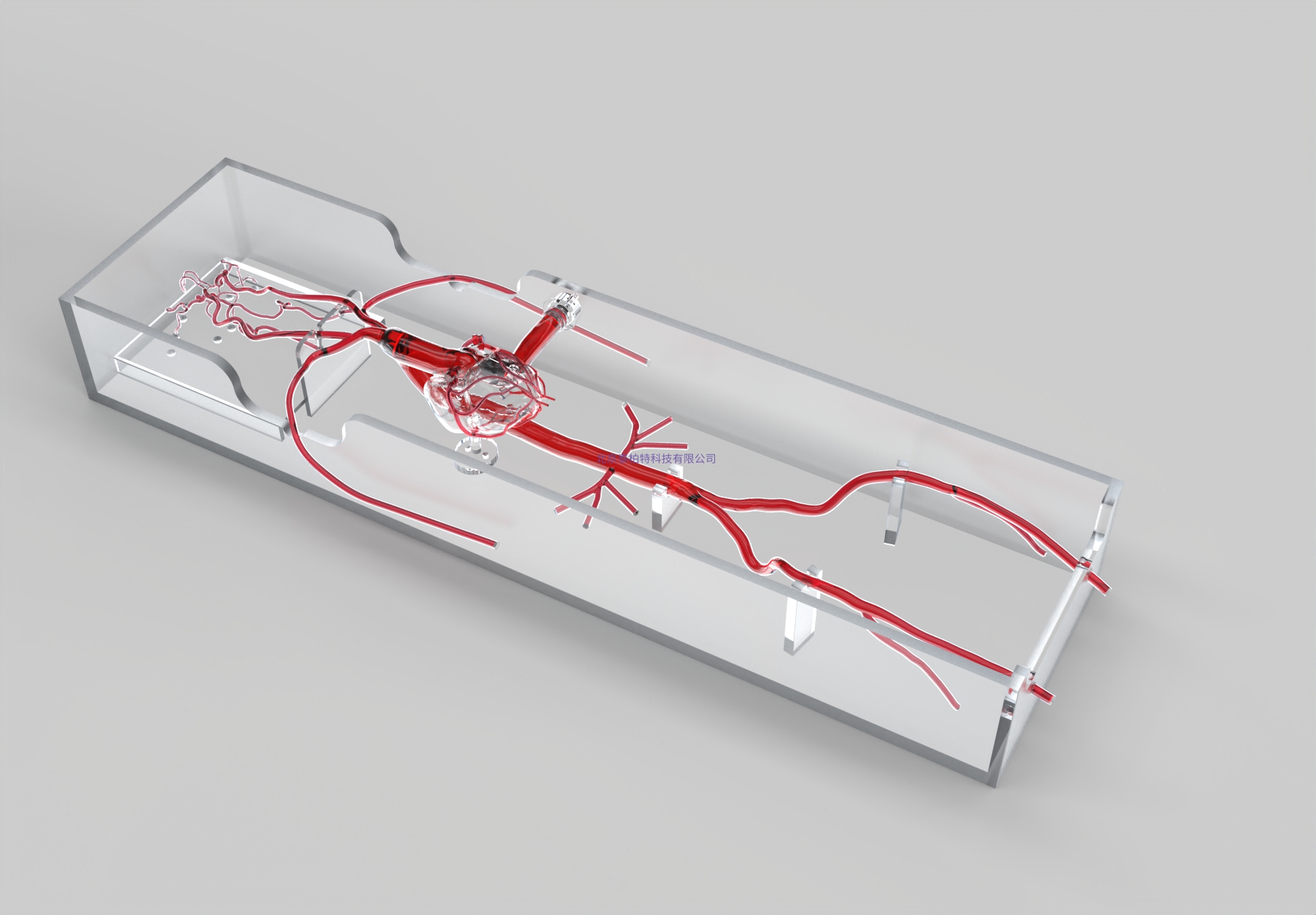 3D人体血液循环仿真系统整体采用仿人形外观设计,包含透明上盖、白色底座、透明软质硅胶血管模型及底部循环水路系统。血管模型部分采用模块化设计,支持搭载病变血管段。血管模型解剖形态及尺寸基于真实成人CT/MRI数据设计制作,涵盖血管介入手术涉及的人体主要动静脉血管,血管模型采用柔性透明硅胶材料制作而成,细节丰富、仿真度高;循环水路设计,保证仿真血液在血管模型内流动方向与真实人体一致,同时采用脉动泵装置,模拟血液温度、压力、流量、心率等多种参数,使整个系统达到模拟真实人体血流动力学效果。该产品可满足血管介入手术的器械测试评估、功能及术式演示、培训等需求。